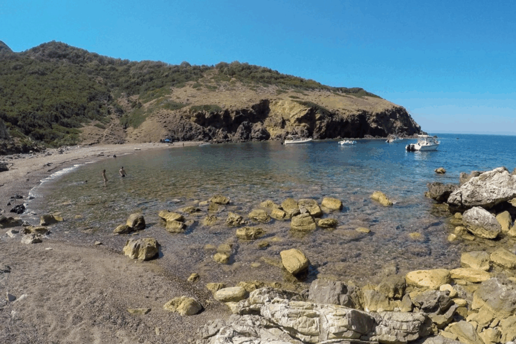 Protetta da un piccolo golfo e circondata da ciottoli grigi, si affaccia su acque trasparenti, ideali per un bagno intimo e solitario. È raggiungibile via mare o attraverso un breve sentiero che attraversa una pineta privata (l’accesso è discreto, ma con rispetto è percorribile).