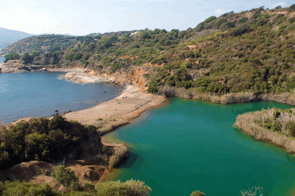 A pochi minuti da Porto Azzurro, la spiaggia di Terranera è uno dei luoghi più suggestivi dell’Elba. Alle sue spalle si apre un lago verde smeraldo di origine mineraria, formatosi in un’antica cava di ematite e pirite.